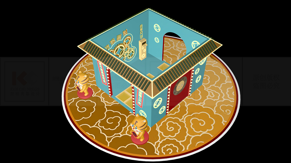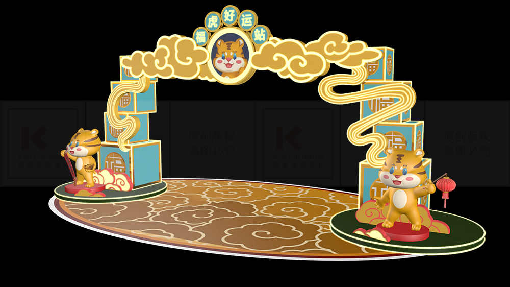 設(shè)計說明:金色祥云聚集而成的拱門,兩側(cè)設(shè)有可愛的虎年IP形象——?;?,邀請大家進入?;⒌暮眠\站,一起讓好運up!