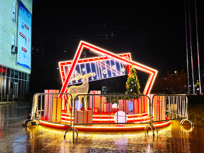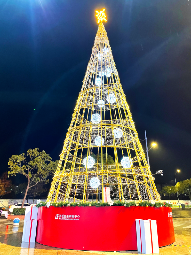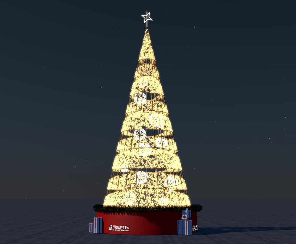 圣誕樹主體高度為12米,給人以仰望與祝愿的氛圍。燈光色系比較簡(jiǎn)潔,主體為金屬鋼架結(jié)構(gòu),使用不規(guī)則的形狀片面式的點(diǎn)燈的亮化來(lái)呈現(xiàn)圣誕樹主體的基本架構(gòu),中間再輔以白光燈球,與外圍形成對(duì)比,來(lái)豐富主體的細(xì)節(jié)。