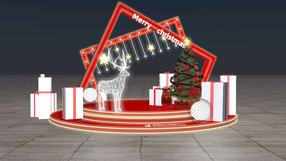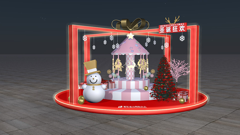 以方形禮盒方形設(shè)計(jì)為主,外觀以禮盒的邊面呈現(xiàn)。再加上上方巨大的結(jié)帶,給人在視覺上呈現(xiàn)出禮物盒的效果。除此之外,中間還擺放了粉色系的旋轉(zhuǎn)木馬,大大增加了活動(dòng)的趣味性和互動(dòng)性,并且十分切合“禮遇”圣誕的主題。另一側(cè)的雪人也是個(gè)活寶,可以吸引很多小孩子前來(lái)拍照留念。而下方印有l(wèi)ogo,在分享照片的同時(shí),使我們的品牌知名度傳播的更加廣泛。