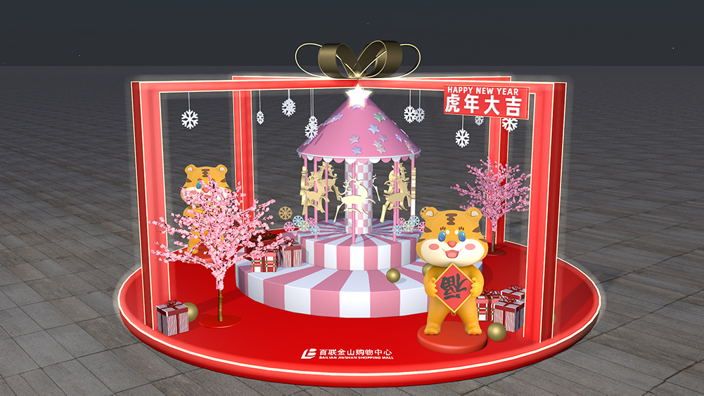 結(jié)合圣誕主題元素進(jìn)行設(shè)計(jì).首先是以一只發(fā)光的小鹿在遙望著圣誕樹,下面有裝禮物的小車,周邊充滿了禮品,給予“神秘的幻想”。整體色調(diào)以白紅色為主,輔以閃閃動(dòng)人的光效,既襯托了圣誕氛圍;又增加增添活潑可愛的氛圍;還能與百聯(lián)金山購(gòu)物中心Logo色首尾呼應(yīng)。